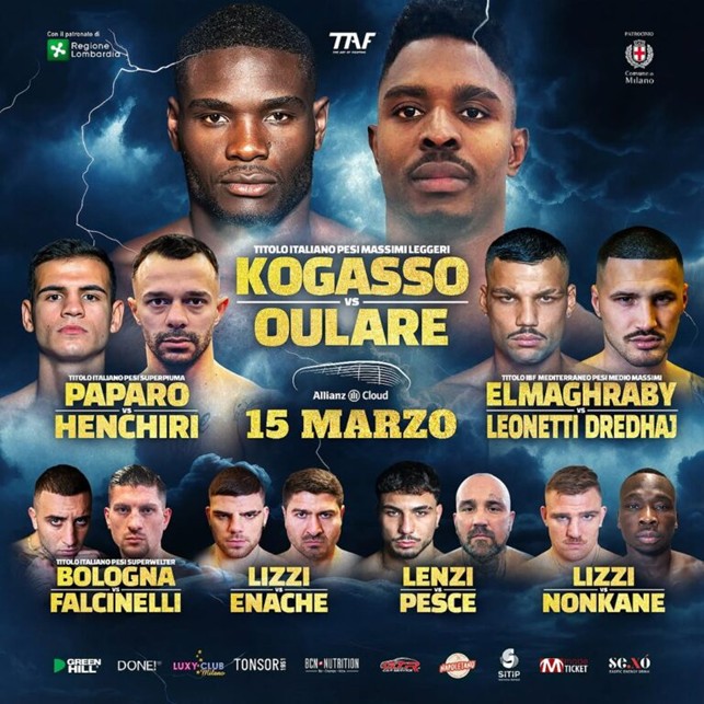 Anche il clou della lunga serata firma l’esito nel secondo round. Il gigante Jonathan Kogasso (15), 28 anni, pro dal 2021, dopo una lunga carriera in maglietta, ha fatto ritrovare il sorriso al suo maestro Vincenzo Gigliotti, che gli aveva chiesto di mettere più cattiveria nei colpi, per evitare sorprese, in uno sport come la boxe, dove il risultato non è mai scritto in precedenza al verdetto. Jonathan è stato di parola. Nella prima difesa del tricolore massimi leggeri, appena conquistato, ha sbrigato la faccenda nel modo più autoritario possibile. Lo sfidante Morike Oulare (7-1), 26 anni, pro dal 2021, allievo di Paolo Pesci, nella palestra Due Torri a Bologna, nativo della Guinea, residente da tempo in Italia, si era presentato al pubblico milanese mostrando una muscolatura impressionante e nel corso del primo round, dimostrava pure una buona impostazione, muovendosi bene e trovando bersaglio un paio di volte. In realtà Kogasso lo aveva studiato per capirne i punti deboli. Nella seconda ripresa, velocizza i colpi lineari e trova la tempia di Oulare, che cade al tappeto e pur rialzandosi, resta senza equilibrio. A mio parere l’arbitro avrebbe dovuto fermarlo, invece fa proseguire il match e Kagasso lo centra al mento. Stavolta la caduta al tappeto è definitiva e drammatica. Un KO spettacolare che conferma le grandi qualità del campione italiano. Ormai maturo verso traguardi maggiori. Per Oulare, uno stop pesante, ma non penso definitivo. Il pugile è giovane e quindi può riprendere l’attività, facendo tesoro della sconfitta. Mentre Kogasso ha tranquillizzato il suo maestro, sulla determinazione al momento opportuno. Per l’Art of Fithting di Edoardo Germani, un gigante dai piedi ben piantati sul tappeto, capace di entusiasmare il pubblico, con l’effetto magico del KO.