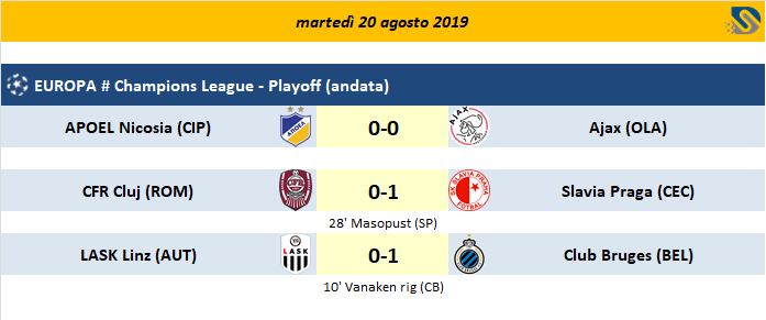 Corsaro anche il Club Bruges che va a vincere a Linz contro la sorpresa LASK; di rigore il successo, trasformato da Vanaken, anche se gli austriaci sfiorano più volte il pari, clamoroso l'auto-palo del difensore belga.