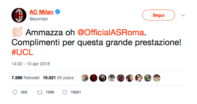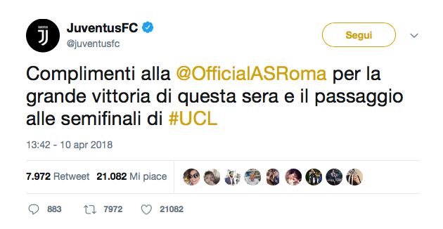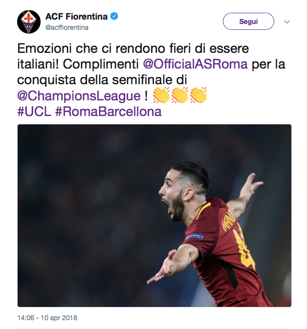 Intanto gran parte dell'Italia fa i complimenti ai capitolini per un'impresa che, qualunque sia il cammino dei giallorossi in Champions League, rimarrà una delle pagine più leggendarie della società. Molte società hanno fatto i complimenti a De Rossi e compagni a mezzo twitter. Prima fra tutti la Juventus, chiamata anch'essa a fare la sua impresa, contro il Real Madrid: "Complimenti alla @OfficialASRoma per la grande vittoria di questa sera e il passaggio alle semifinali di .UCL". Puntuale anche il tweet della Fiorentina: "Emozioni che ci rendono fieri di essere italiani! Complimenti @OfficialASRoma per la conquista della semifinale di @ChampionsLeague!" Simpatici gli auguri del Milan: "Ammazza oh @OfficialASRoma. Complimenti per questa grande prestazione! #UCL". L'impresa della squadra di Di Francesco ha davvero unito tutto l'Italia