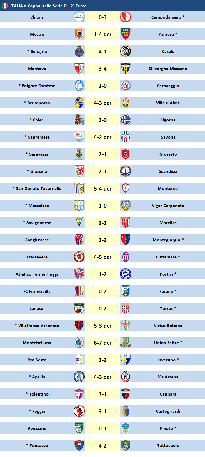 Di scena il 2° Turno della Coppa Italia di Serie D; fuori il detentore del trofeo, il Matelica eliminato dalla Savignanese. Tutto facile, anche in Coppa, per il Seregno, così come senza affanni Campodarsego, Folgore, Chieri, Foggia e Ponsacco.