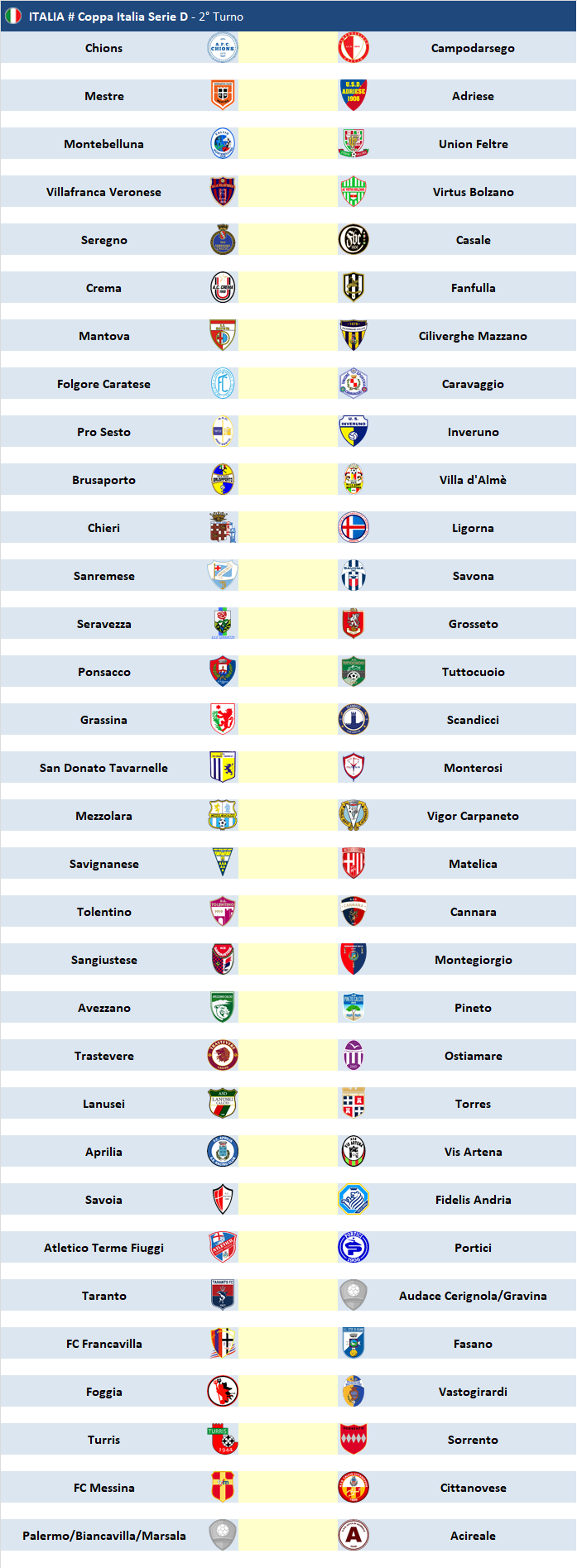 Sorteggiato il 2° Turno della Coppa Italia Serie D, che si giocherà mercoledì 25 Settembre; alle 55 qualificate si aggiungono le 9 formazioni che hanno partecipato alla Coppa Italia "maggiore". In realtà mancano all'appello ancora 2 squadre, in quanto si deve giocare Palermo-Biancavilla (11/9 per il Turno Preliminare) e Audace Cerignola-Gravina (11/9) e Marsala-vinc Plaermo/Biancavilla (per il 1° Turno).