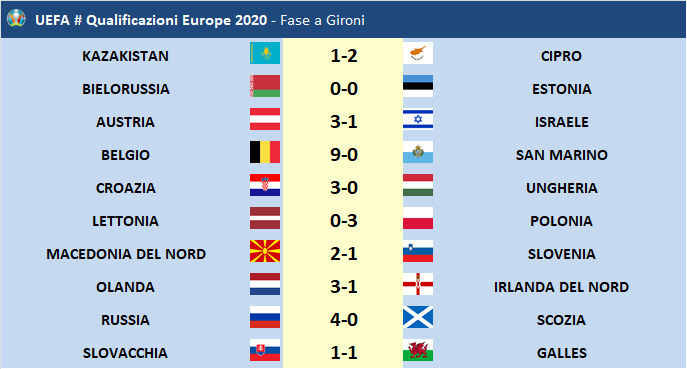 Begio qualificato!! Goleada contro San Marino (9-0!!) che vale il pass per i prossimi Europei "itineranti" 2020. I belgi sono la prima squadra a qualificarsi con 3 turni d'anticipo. Nello stesso girone sorride anche la Russia (poker alla Scozia) alla quale basta un punto, Cipro vince in rimonta sul Kazakistan ed ha ancora una lievissima speranza.