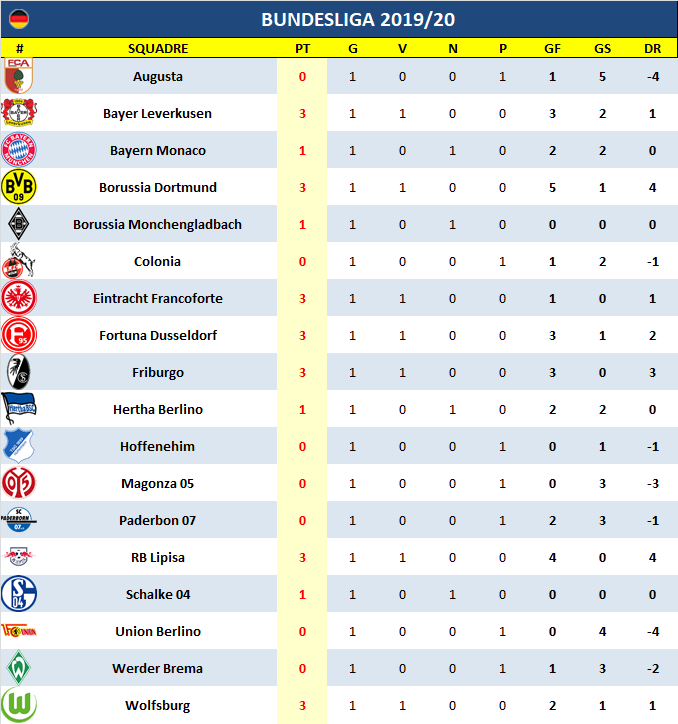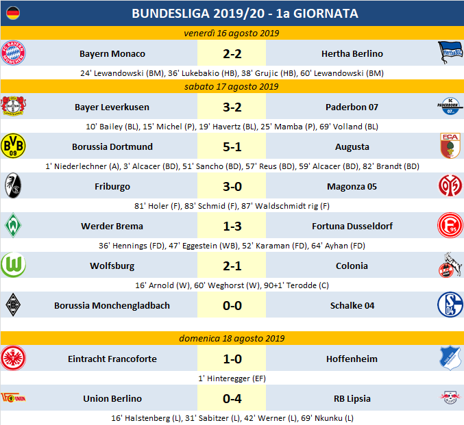 Partenza a razzo del Borussia Dortmund che rifila una cinquina all’Augusta e distanzia subito il Bayern Monaco che non va oltre il pari casalingo contro l’Hertha Berlino (salvato dal solito Lewandowski). Anche il Lipsia passeggia con la neo-promossa Union Berlino servendo il poker, vince facile il Friburgo contro il Magonza, sorprende il successo esterno del Fortuna Dusseldorf in casa del Werder Brema. Soffre ma vince anche il Bayer Leverkusen che soffe col Paderbon, vincono anche Eintracht Francoforte e Wolfsburg; pari invece fra Monchenglabach e Schalke.