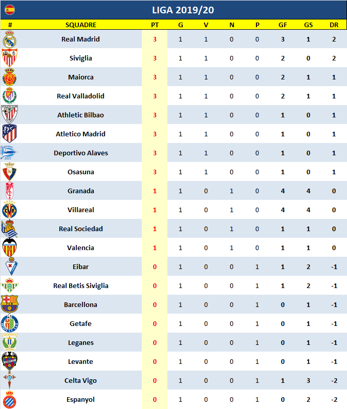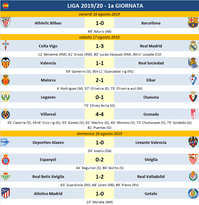 Esordio amaro per i campioni in carica del Barcellona che escono sconfitti da Bilbao contro l’Athletic; Valverde (orfano di Messi) sfortunato con 2 legni, viene castigato ad un minuto dal termine dalla splendida rovesciata di Aduriz che fa impazzire il San Mames. Ne approfittano subito il Real Madrid che va a vincere a Vigo e l’Atletico Madrid di misura sul Getafe; Zidane e Simeone non steccano. Vittorie esterne per il Siviglia in casa dell’Espanyol, della Real Valladolid a Siviglia contro Real Betis e dell’Osasuna sul Leganes; successi anche per Maiorca sull’Eibar e dell’Alaves sul Levante. Pari spettacolare con 8 reti fra Villareal e Granada, fermato in casa anche il Valencia.