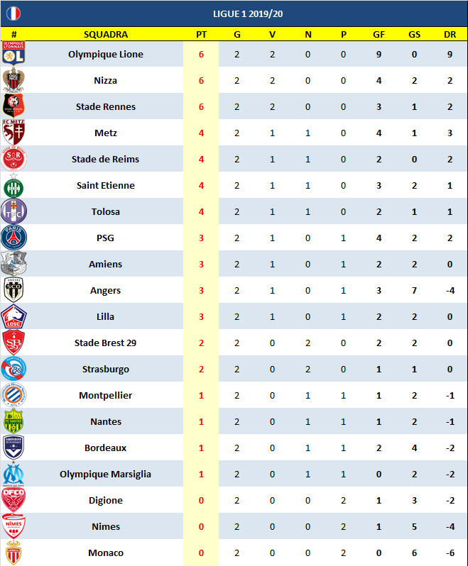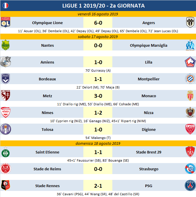 Come in Spagna, ecco la sorpresa che non ti aspetti; ko del colosso PSG al cospetto dello Stade Rennes. Non basta Cavani a parigini che incassano la prima sconfitta, con i rosso-neri della Bretagna al comando. Scappa subito il Lione (ancora Dembele e Depay) che gioca a “tennis” con l’Anger e resta a punteggio pieno insieme al Nizza che sbanca Nimes. Vittoria convincente del Metz che rifila un tris al Monaco sempre più in crisi (esattamente come l’anno scorso), vince anche il Tolosa che batte il Digione e l’Amiens che castiga il Lilla. Non risorge il Marsiglia che guadagna un punto a Nantes, pari anche del Bordeaux fermato dal Montpellier, dello Straburgo a Reims e del Saint Etienne col Brest.