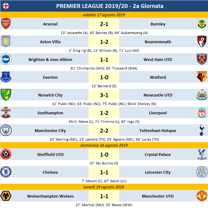 Pochettino aveva promesso che per il titolo ci sarebbe stato anche il suo Tottenahm, ed ecco che gli “Spurs” fermano il Manchester City sul pari (Lamela e Lucas rispondono a Sterling ed Aguero). Rallenta subito Guardiola anche se domina l’incontro e polemizza col VAR; ne approfitta subito il Liverpool che seppur soffrendo vince col Southampton (Manè e Firmino), con Klopp che vola al comando a punteggio pieno, insieme all’Arsenal che batte di misura il Burnely. Rallenta anche lo United ("tradito" da Pogdba che sbaglia dal dischetto) che nel posticipo viene fermato dai Wolves (possimi avversari del Torino in Europa League); non si rialza il Chelsea che pareggia in casa col Leicester. Successo esterno del Bournemouth che vince in casa dell’Aston Villa, sorridono anche Everton, Norwich e Sheffield UTD; pari interno del Brighton che resta comunque nelle zone alte.