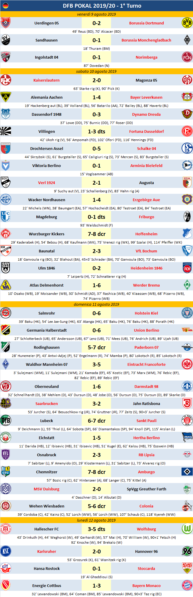Fra una settimana il Campionato, ma in Germania si parte con la "Coppa" (DFB POkal). Subito fuori due squadre di Bundesliga: il Magonza perde con Kaiserlautern, mentre l’Augusta è castigata dalla sorpresa Verl. Tutto facile per le big, con Bayern Monaco, Borussia Dortmund, Schalke 04, Werder Brema e Bayer Leverkusen che passeggiano; di misura il successo del Monchengladbach, Norimberga, Lipsia e Stoccarda. Soffrono più del dovuto Eintracht Francoforte, Fortuna Dusseldorf, Friburgo e Wolfsburg, con gli ultimi 3 che passano solo dopo i supplementari, ma addirittura devono ringraziare i rigori Hoffenheim, Paderborn, Amburgo e Colonia. Passano il turno anche Duisburg, Karlsruher, Hertha Berlino, Saarbrucken, Darmstadt, Union Berlino, Holstein Kiel, Heidenheim, Bochum, Erzgebirgie Aue, Arminia Bielefeld e Dynamo Dresda.
