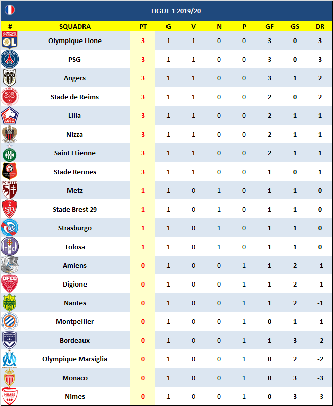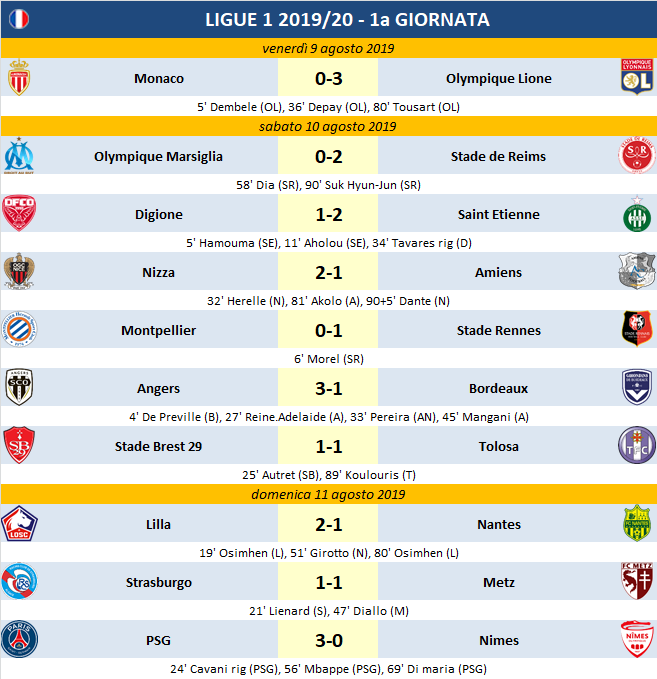 Si fa sul serio anche in Francia con la Ligue 1 2019/20: anche qui si parte col dominio del PSG che con un secco tris dei suoi tenori (Cavani, Mbappe, Di Maria) - seppur ancora “orfano” di Neymar – annichilisce il Nimes. Tutto facile anche per l’Olympique Lione che sbanca Montecarlo, col Monaco che parte ancora male; sorprende il successo esterno dello Stade Reims che va a vincere a Marsiglia, con l’Olympique di Villas Boas subito ko. Bene anche il Saint Etienne a Digione e lo Stade Renners che sbanca Montpellier. Tre punti anche per il Nizza all’ultimo respiro sull’Amiens, per l’Angers di rimonta sul Bordeaux e del Lilla sul Nantes; pari del Tolosa allo scadere a Brest e del Metz a Strasburgo.