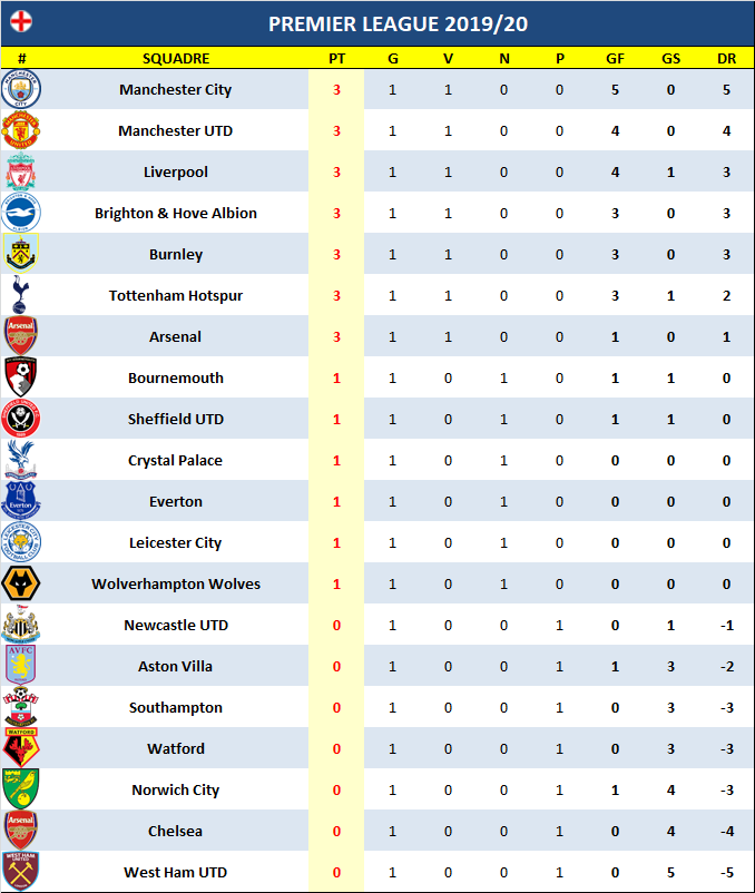 Partita ufficialmente la Premier League 2019/20 e si inizia dove si era finiti; prevedibile il botta e risposta fra Liverpool e Manchester City, ma si inserisce prepotentemente anche lo United. Ai “reds”, campioni d’Europa, di Klopp bastano i primi 45’ per chiudere la pratica Norwich; risponde con una cinquina il City di Guardiola, con Sterling sugli scudi protagonista di una tripletta che annienta il West Ham. Big-match al Manchester United di Solskjaer che affonda il Chelsea di Lampard, servendo il poker (doppio Rashford). Il Tottenham Hotspur di Pochettino vince in rimonta grazie al solito Kane (doppietta) che ribalta l’Aston Villa; successo di misura per l’Arsenal che con Aubameyang liquida il Newcastle UTD. Vincono anche Brighton e Burnely che con un tris sbrigano, rispettivamente, le pratiche Watford e Southampton; pareggi esterni per gli “italiani”, con Kean nell’Everton fermato dal Crystal Palace e Cutrone nel Wolverhampton stoppato dal Leicester, pari anche dello Sheffield UTD che si salva nel finale contro il Bournemouth.