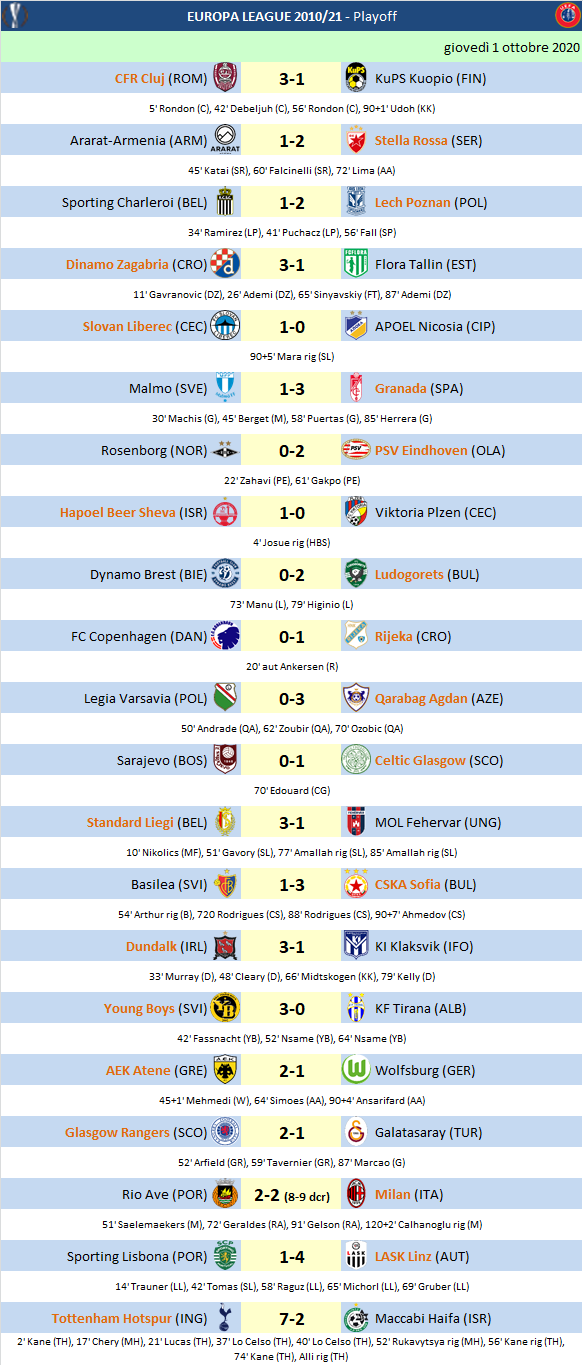 Ultimato anche l'ultimo turno di Europa League prima della Fase a Gironi; passa il Milan che agguanta il pari al 122' e castiga, dopo una serie infinita di rigori i portoghesi del Rio Ave. Fan rumore le cadure del Wolfsburg (par mano dell'AEK Atene), dell Basilea che crolla in casa (passa il CSKA Sofia), e Galatasaray. Tutto facile invece per il Tottenham che dilaga, sorride anche il Granada; clamorosa l'affermazione degli azeri del Qarabag che fan fuori il Legia Varsavia, sorprendono anche i croati del Rijeka. Ok le scozzesi di Glasgow (Celtic e Rangers), perentori successi per LASK Linz e Young Boys, corsari invece il PVS, Stella Rossa, Ludogorets e Lech Poznan; passano il turno anche CFR Cluj, l'altra croata della Dinamo Zagabria, i cechi dello Slovan Liberec, Hapoel Beer Sheva, Standard Liegi e la prima qualificazione di una squadra irlandase del Dundalk.