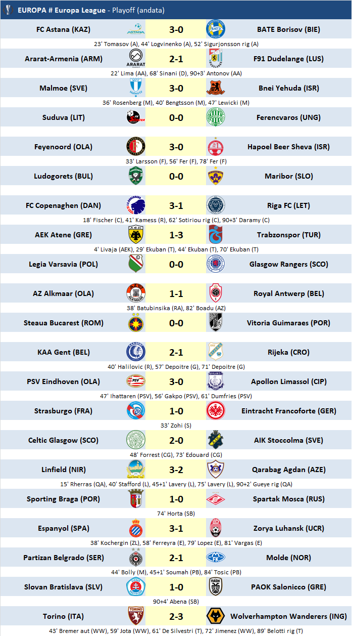 Colpaccio esterno per i turchi del Trabzonspor che vanno a vincere ad Atene contro l’AEK, nonostante lo svantaggio iniziale; risultato che mette quasi a sicuro il passaggio del turno. Tutto facile anche per le olandesi: sia il PSV Eindhoven che il Feyenoord rifilano un tris rispettivamente ai ciprioti dell’Apollon Limassol ed agli israeliani dell’Hapoel Beer Sheva. Sorridono anche Malmoe ed Astana che con lo stesso risultato ipotecano il pass, surclassando rispettivamente col Bnei Yehuda ed il BATE Borisov.