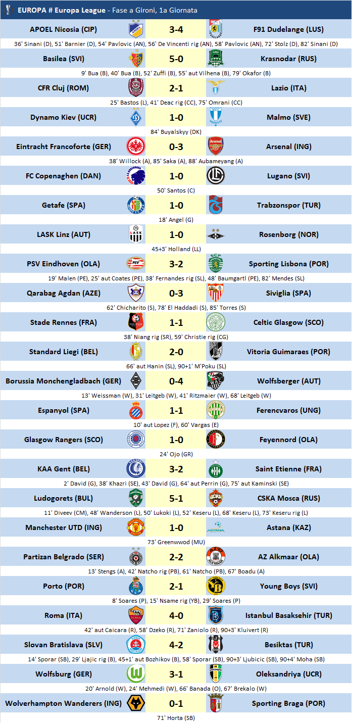 Colpo di coda dello Slovan Bratislava con la formazione slovacca che trova la vittoria sul favorito Besiktas nei minuti di recupero; altra sorpresa la vittoria esterna dello Sporting Braga corsaro che batte il Wolverhampton Wanderers.