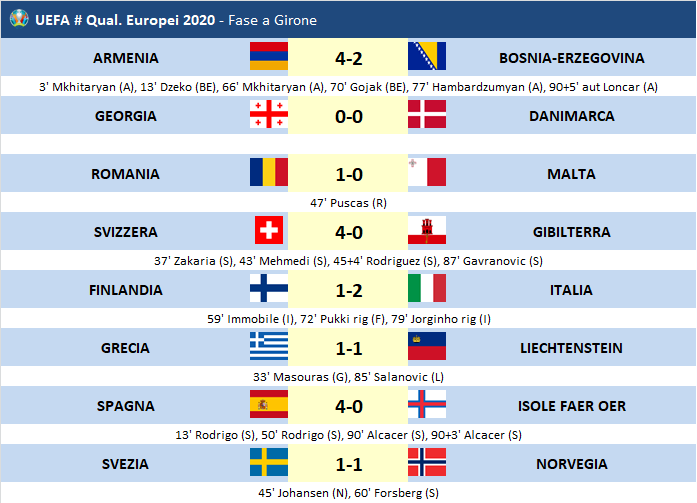 En-plein dell’Italia che vince anche in Finlandia (1-2) ed è ad un passo dalla qualificazione; i finlandesi restano comunque la secondo posto e devono guardarsi le spalle ora dalla sorprendente Armenia che vince sulla Bosnia-Erzegovina (4-2) ed effettua il sorpasso. Continua invece la crisi della Grecia che in casa viene fermata sul pari dal Liechtenstein, col piccolo stato che conquista il primo punto.