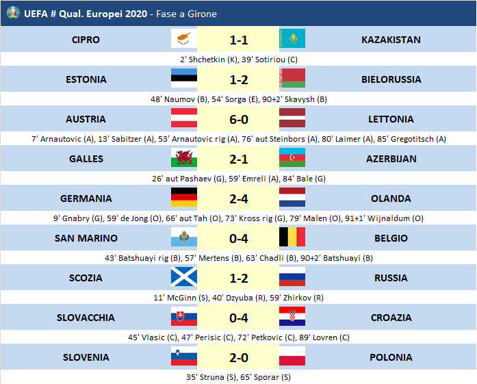 Sorprende il ko della Polonia sconfitta dalla Slovenia (2-0) che torna in carreggiata; ne approfitta subito l’Austra che sommerge la Lettonia (6-0) ed accorcia le distanze dalla vetta.