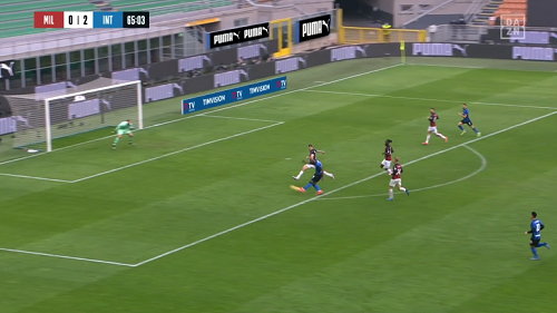 L'avvio di ripresa è di marca Milan con Ibra che sfiora il pareggio ma trova la risposta di un attento Handanovic che si supera anche sul tentativo successivo di Zlatan prima che, al 48', il portiere dell'Inter respinga anche la conclusione di Tonali dal limite. Nel momento di massima spinta del Milan, l'Inter trova il raddoppio: spunto di Hakimi, la palla arriva ad Eriksen che la appoggia per Perisic, tocco al centro per Lautaro che firma il 2-0. Il Milan è in bambola e, al 62', Lukaku sfiora il 3-0 ma calcia addosso a Donnarumma. È solo il prologo del gol di Big Rom che arriva al 65' con una progressione di 30 metri del belga che semina Romagnoli e trafigge Donnarumma sul primo palo. Il gol del 3-0 fa calare il sipario su un match mai in discussione. L'Inter vince 3-0 e sale a 53 punti, il Milan incappa nel terzo KO nelle ultime sei e resta fermo a 49 punti. Altro campanello d'allarme per i rossoneri dopo il tonfo di La Spezia.