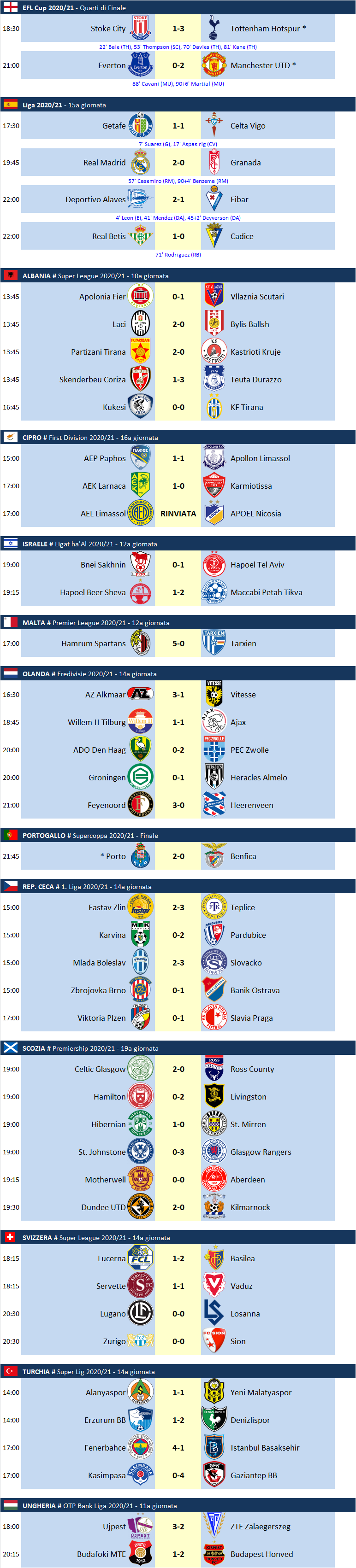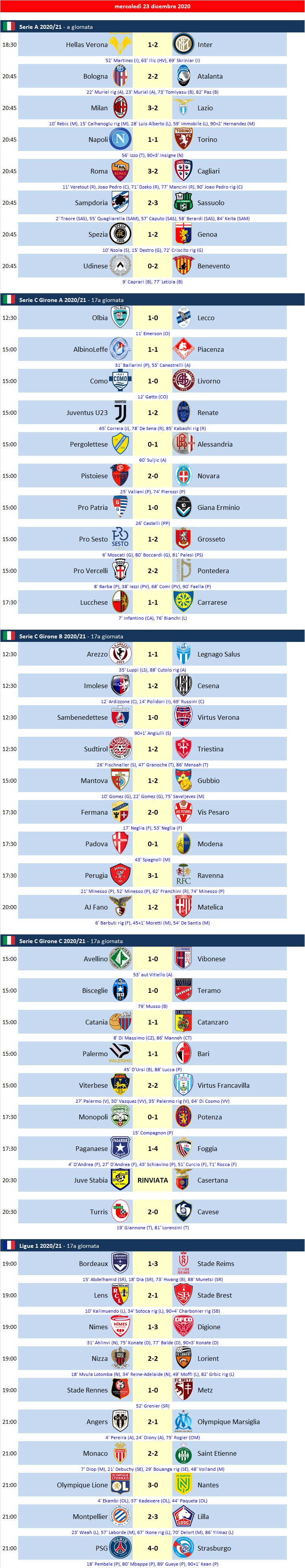 Segui le dirette di tutte le partite odierne, mercoledì 23 Dicembre 2020
