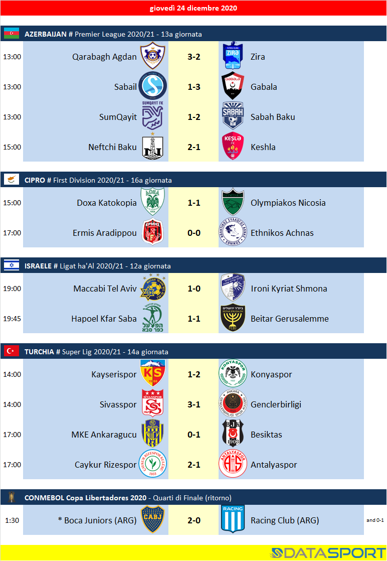 Segui le dirette di tutte le partite odierne, giovedì 24 Dicembre 2020