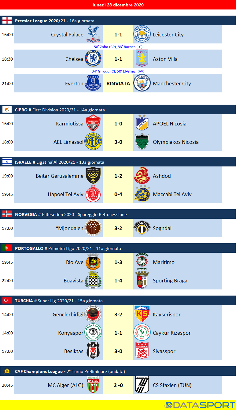 Segui le dirette di tutte le partite odierne, lunedì 28 Dicembre 2020