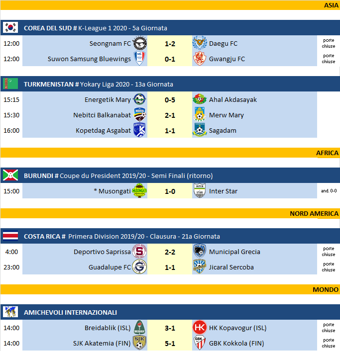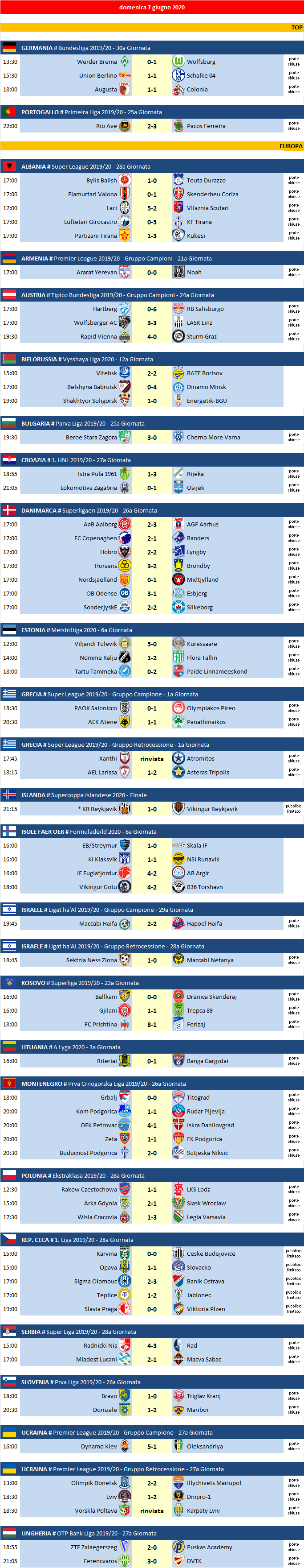 Partite di domenica 7 Giugno 2020