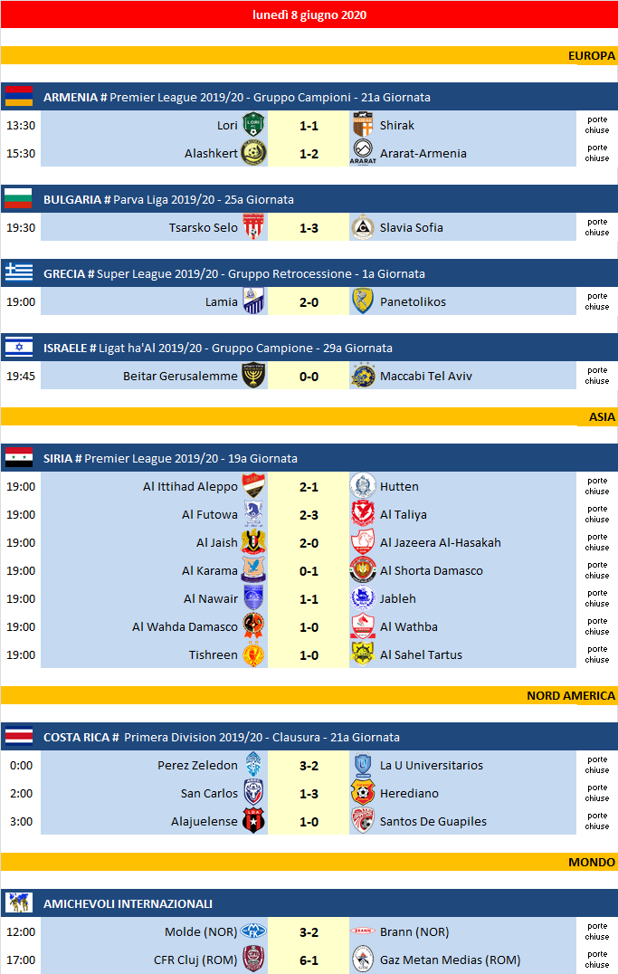 Partite di lunedì 8 Giugno 2020