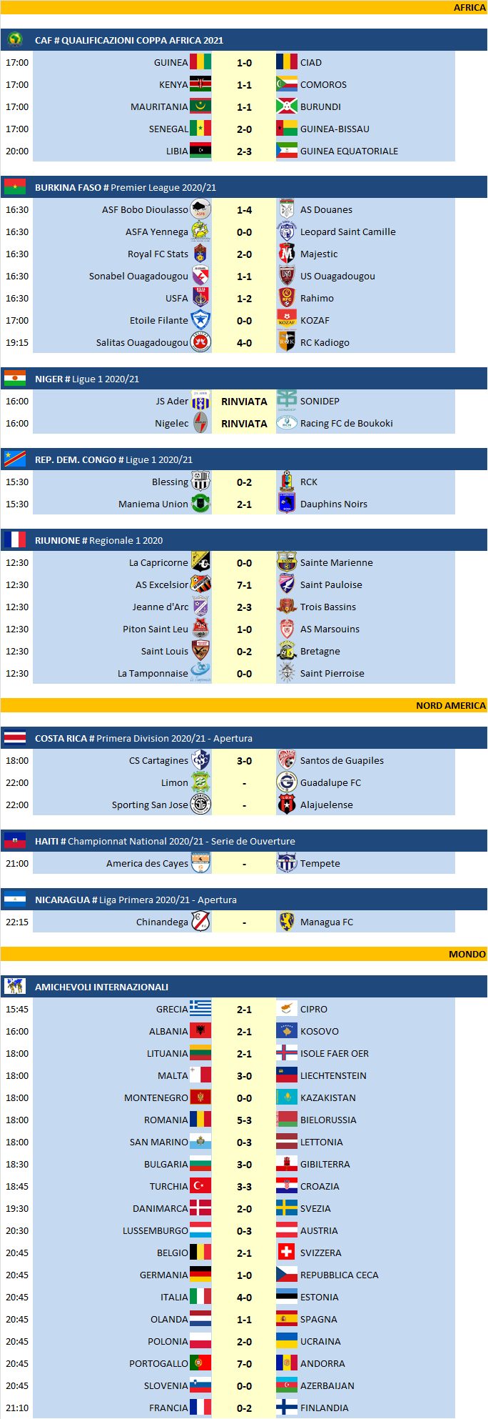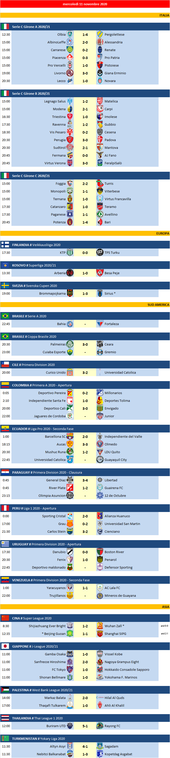 Tutte le partite di mercoledì 11 Novembre 2020