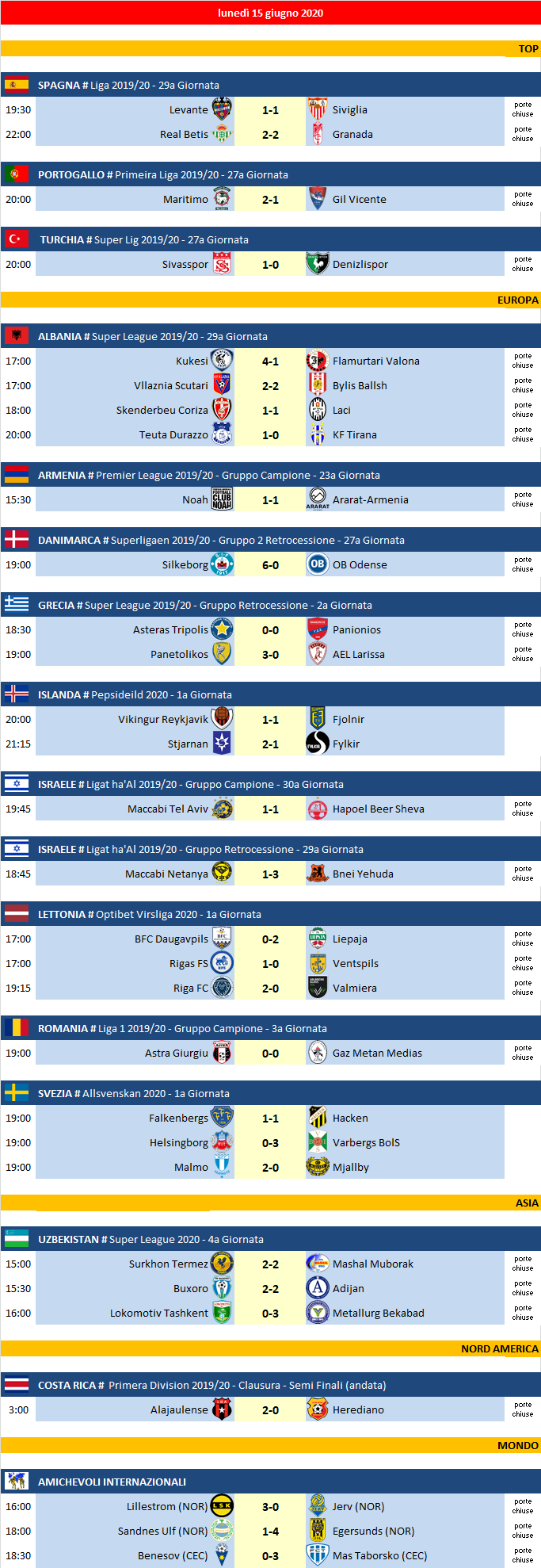 Classifiche: TOP - EUROPA - SUD AMERICA - ASIA - AFRICA - NORD AMERICA - OCEANIA
