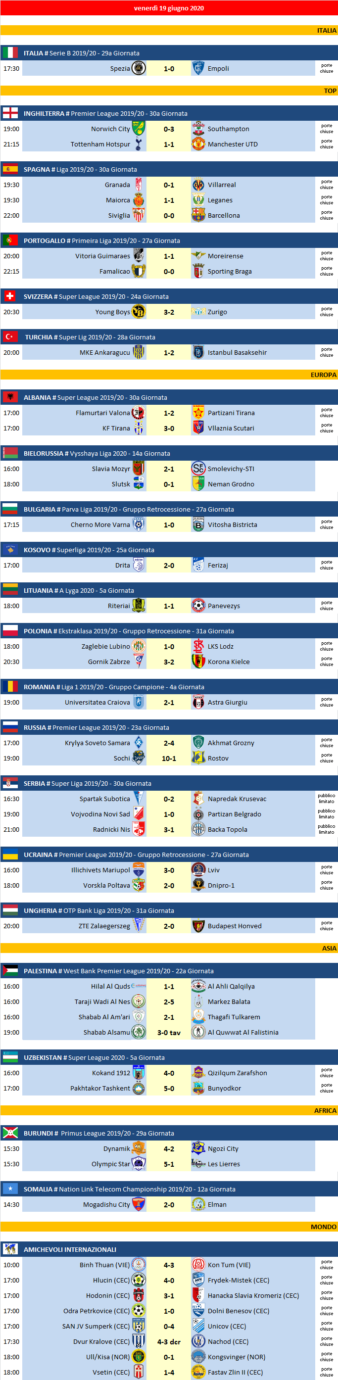 Partite di venerdì 19 Giugno 2020