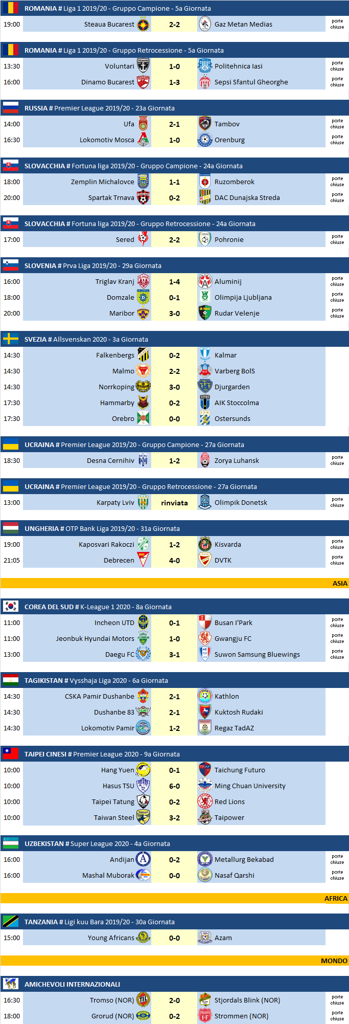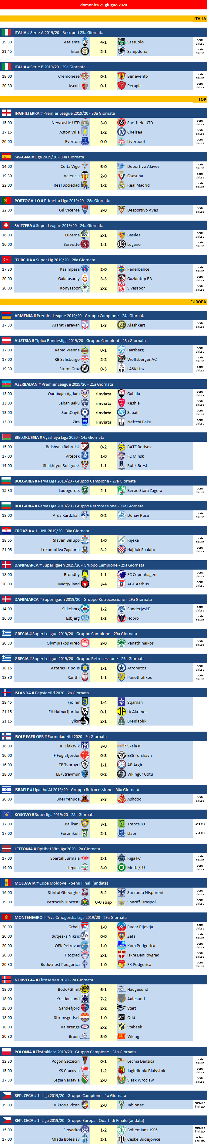 Partite di domenica 21 Giugno 2020