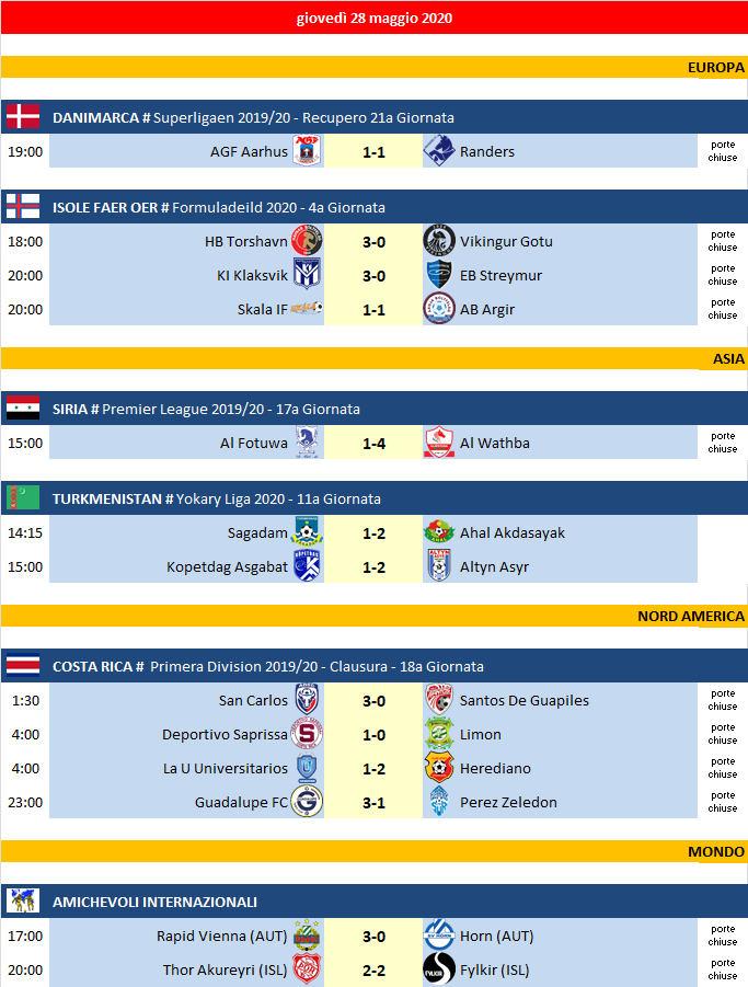 Partite di giovedì 28 Maggio 2020