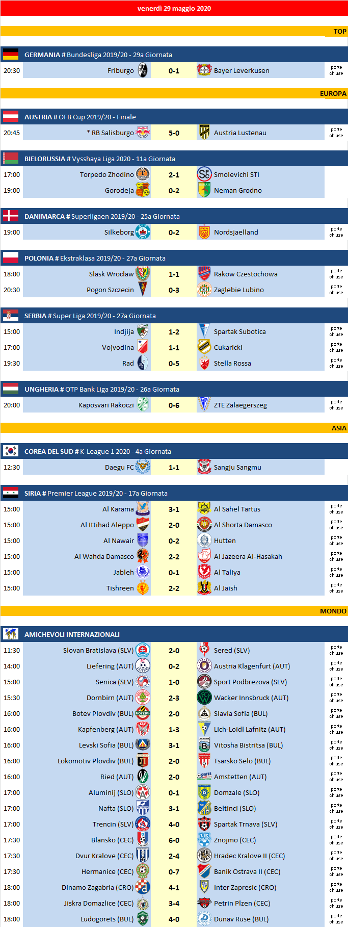Partite di venerdì 29 Maggio 2020