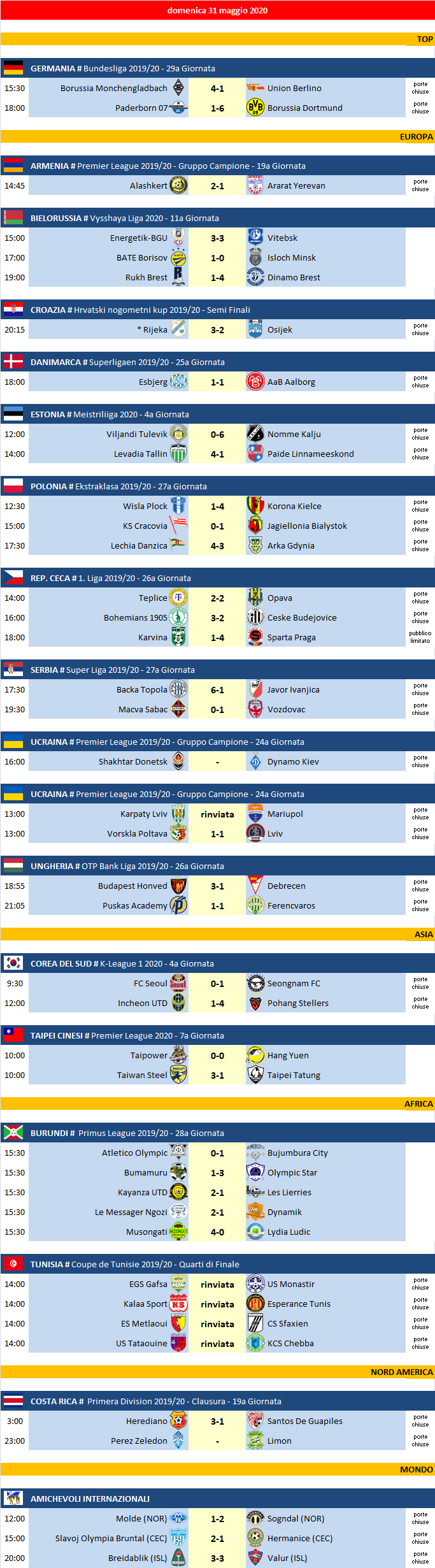 Partite di domenica 31 Maggio 2020