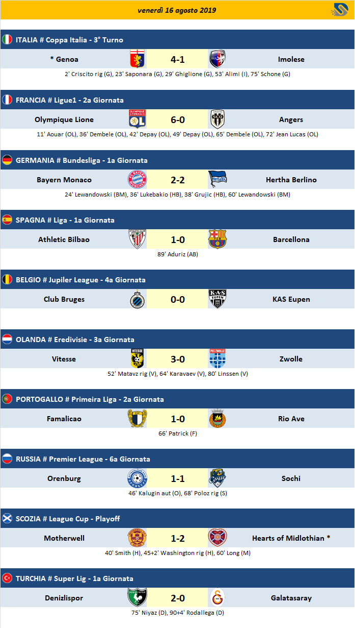 Risultati - Partite del 16/08/2019