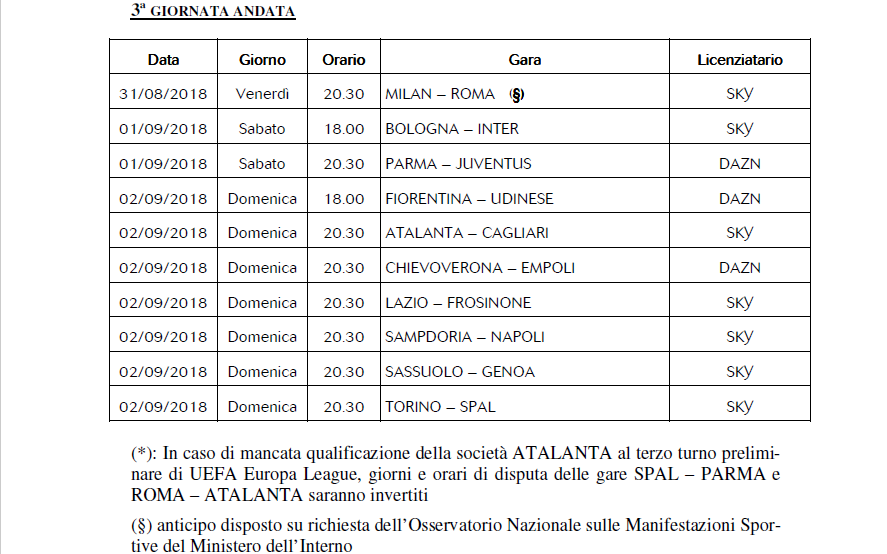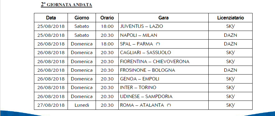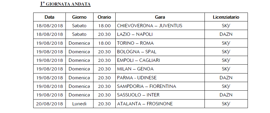 Da segnalare che l'esordio di Cristiano Ronaldo con la maglia della Juventus al Bentegodi, in programma sabato 18 agosto alle ore 18.00, coinciderà anche con la gara d'apertura del campionato. In serata alle ore 20.30 spazio all'atteso Lazio-Napoli, il big match della 1agiornata che potrà essere guardato soltanto sulla nuova piattaforma DAZN, così come l'esordio dell'Inter a Sassuolo di domenica sera. I campioni d'Italia apriranno anche la 2a giornata con la sfida interna contro la squadra di Inzaghi di sabato 25 agosto alle 18.00, visibile su Sky. Seguirà in serata il primo confronto del Napoli di Ancelotti e il suo vecchio Milan, in esclusiva su DAZN. Il posticipo di lunedì sera invece vedrà impegnata la Roma che ospiterà in casa la temibile Atalanta, impegnata nel frattempo con i possibili preliminari di Europa League. L'anticipo della 3a giornata inizierà invece venerdì sera a San Siro, quando si sfideranno Milan e Roma, che pochi giorni dopo comincerà il girone di Champions League. La partita sarà in esclusiva sui canali Sky, come quella di sabato pomeriggio dell'Inter in trasferta a Bologna mentre il posticipo di sabato 1 agosto, cioè Parma-Juventus, sarà visibile soltanto su DAZN.