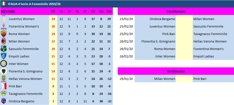 Di seguito la situazione della Serie A Femminile, con la Juventus Women che sta dominando il campionato, con la Fiorentina Women's come prima antagonista.