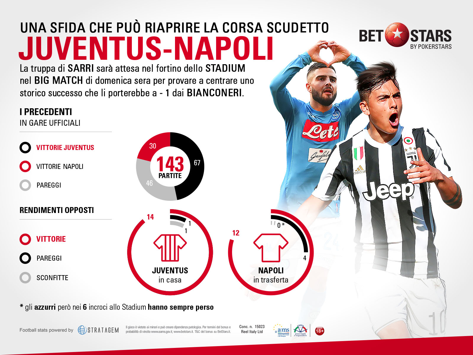 Il Napoli sogna la vittoria e la grande impresa che lo porterebbe a -1 dalla Juventus e in vantaggio psicologico nella lotta-scudetto (i bianconeri devono ancora affrontare Roma e Inter), ma i numeri smorzano l'entusiasmo degli azzurri e spingono il vento della vittoria dalla parte della Juventus. Il bilancio complessivo delle sfide tra la capolista e la sua grande rivale è sconfortante per gli uomini di Sarri, e parla di sole 37 vittorie del Napoli in 160 precedenti, con 48 pareggi e 75 vittorie della Juventus: numeri che diventano impietosi anche nelle ultime cinque stagioni, con 7 vittorie torinesi in 12 sfide e solo tre successi partenopei, ma anche la soddisfazione di strappare una Supercoppa Italiana alla Juventus grazie ai rigori e a Rafael.