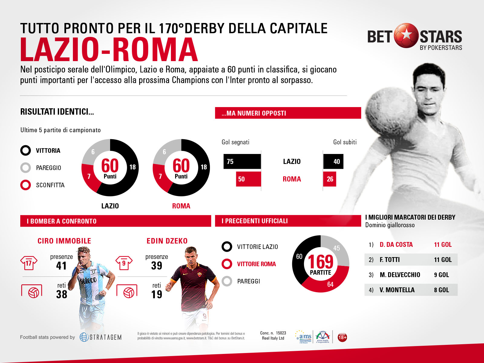 Nella stracittadina di andata l'hanno spuntata i giallorossi 2-1 con un uno-due micidiale firmato Perotti-Nainggolan a inizio ripresa e a poco è servita la rete di Immobile a venti minuti dalla fine. I numeri strizzano l'occhio alla Roma: la Lazio infatti ha perso gli ultimi 3 derby di campionato giocati in casa (2-0 nel 2016-17, 4-1 nel 2015-16 e 2-1 nel 2014-15). L'ultimo successo casalingo dei biancocelesti nella stracittadina in Serie A risale alla stagione 2012-13: in quell'occasione la squadra di Vladimir Petkovic batté quella di Zdenek Zeman 3-2.