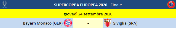 La UEFA ha deciso, la Supercoppa Europea 2020 fra Bayern Monaco (vincitore della Champions League) e Siviglia (vincitore della Europa League) si disputerà giovedì 24 Settembre 2020 a Budapest (Ungheria).