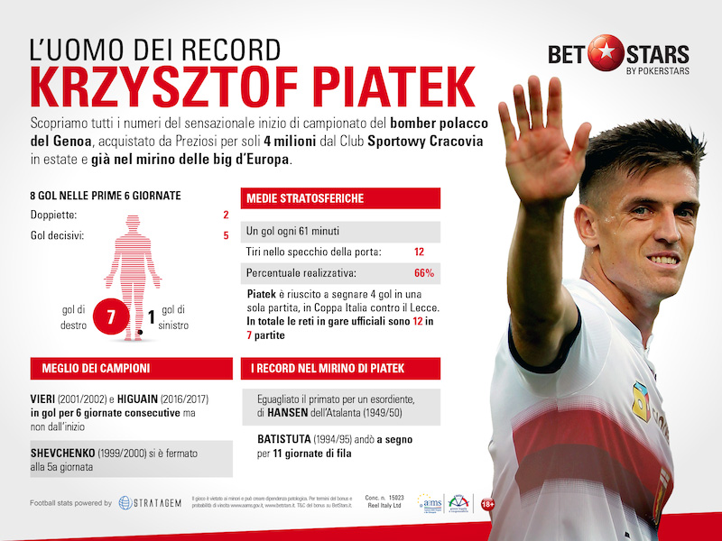 Inizio di campionato da sogno per Krzysztof Piatek, che con 8 gol nelle prime 6 giornate è diventato l'uomo copertina e l'affare dell'anno per tutti coloro che l'hanno comprato al fantacalcio. E Preziosi, che l'ha pagato 4 milioni la scorsa estate, si sta già fregando le mani. Le pistole continuano a sparare e non vuole saperne di riposarle nella custodia. Krzysztof Piatek, 23 anni compiuti a luglio, è senza dubbio l'uomo del momento. E pensare che era un semisconosciuto fino all'11 agosto, quando in Coppa Italia riuscì a segnare 4 gol in 39 minuti al Lecce. Un fuoco di paglia, hanno pensato alcuni. Invece è stato solo l'inizio. In Serie A ha cominciato a segnare alla seconda giornata, ma solo perchè la prima con il Milan il Genoa l'ha dovuta saltare, e non si è più fermato. Un gol all'Empoli, due al Sassuolo, uno a Genoa, Lazio e Chievo e ancora due al Frosinone. Un repertorio che non si limita all'opportunismo, perchè tra le sue perle ci sono anche reti di pregevole fattura, tiri dalla distanza e battute volanti. Ballardini ha avuto l'ulteriore merito di individuare la spalla adatta per esaltarne al meglio le caratteristiche. Quel Christian Kouamé che con la sua rapidità gli porta via l'uomo e lo mette in condizioni di battere a rete. Nell'ultima partita con il Frosinone è stato proprio l'ivoriano ex Salernitana a fornire a Piatek i due assist vincenti.